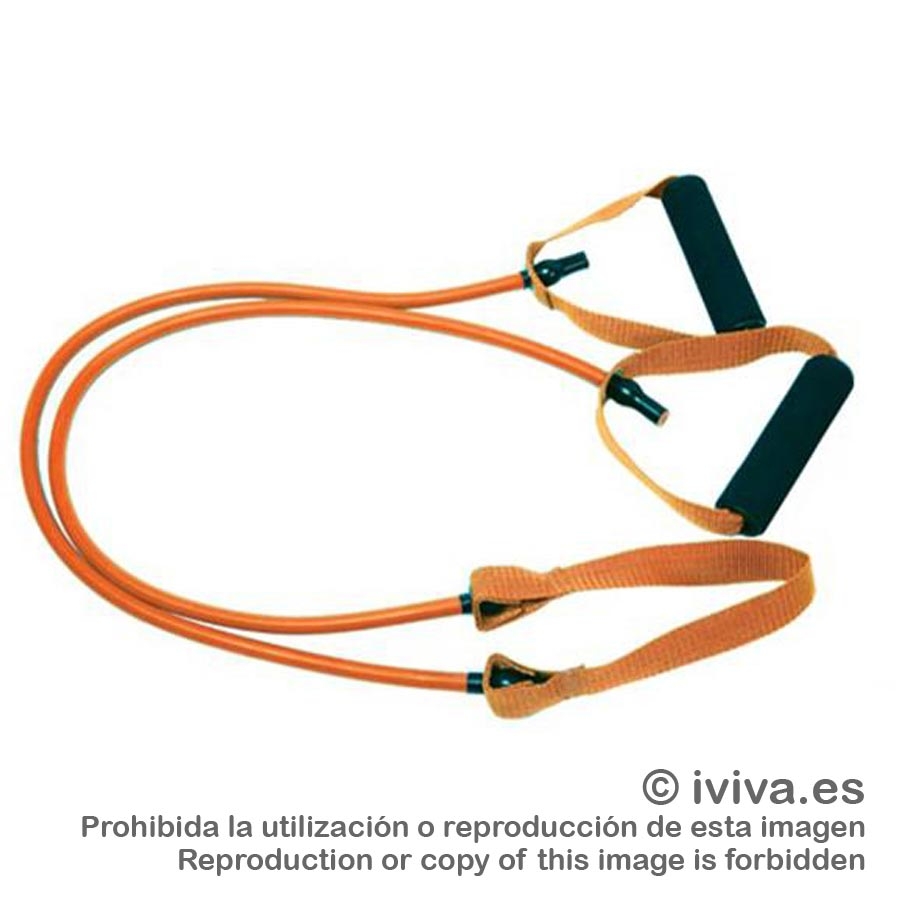 Descripción: Tubo de resistencia con cinta central fabricado con caucho de la mejor calidad. Incorporan además unas empuñaduras muy cómodas de usar que evitan el daño en las manos al utilizarlo. Densidad fuerte. Este modelo incorpora una cinta central para evitar que el caucho se dañe al sujetarlo en algún tipo de estructura o con nuestros pies.