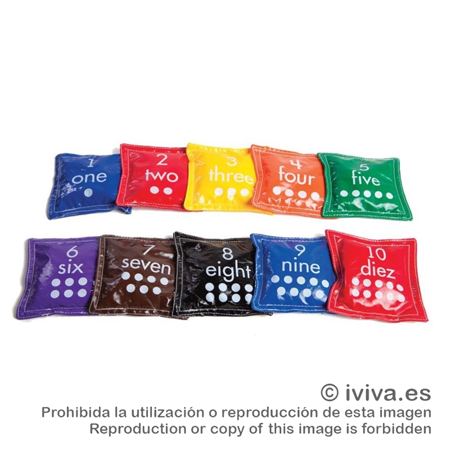 Descripción: Conjunto de 10 saquitos que incluyen los números, puntos y palabras. Se suministran en colores diferentes y las palabras de los números están en inglés. Peso 70 gr.