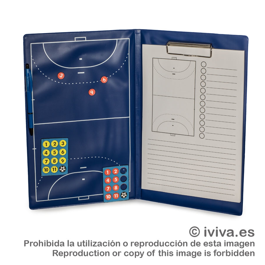 Descripción: Carpeta magnética para balonmano-fútbol sala, con fichas magnéticas y soporte/clip con hojas. Incluye bolígrafo.